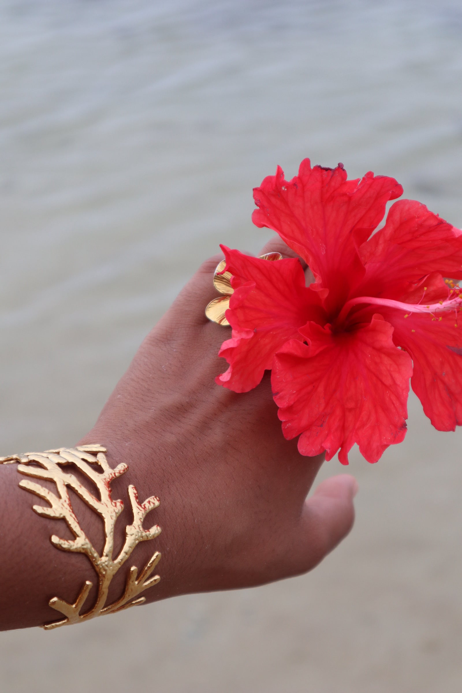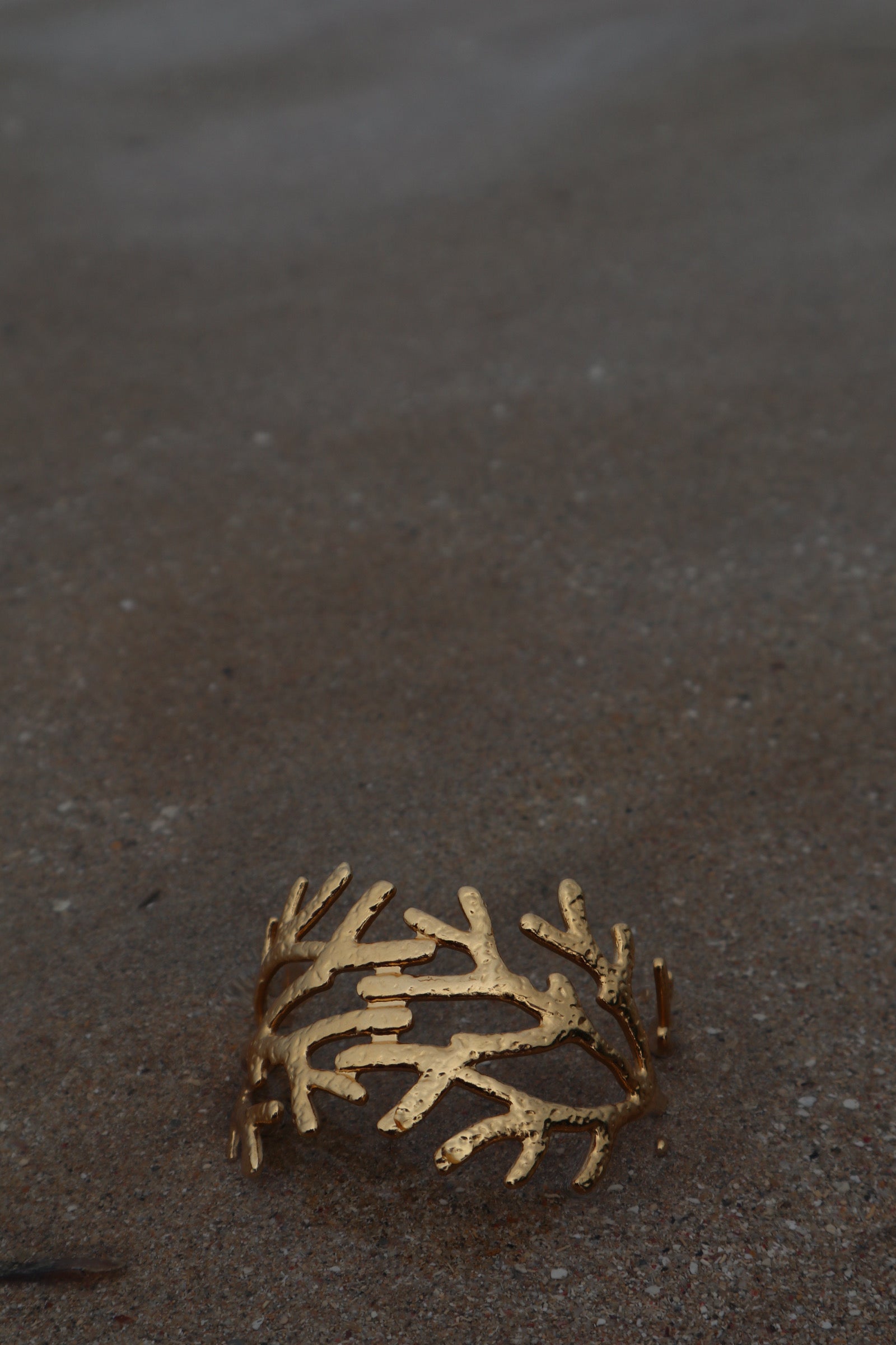 Diseño de coral dorado en textura rústica. Ancha, ajustable y liviana. Pa’ las que se atreven a usar arte en la piel. Statement tropical, sin esfuerzo.