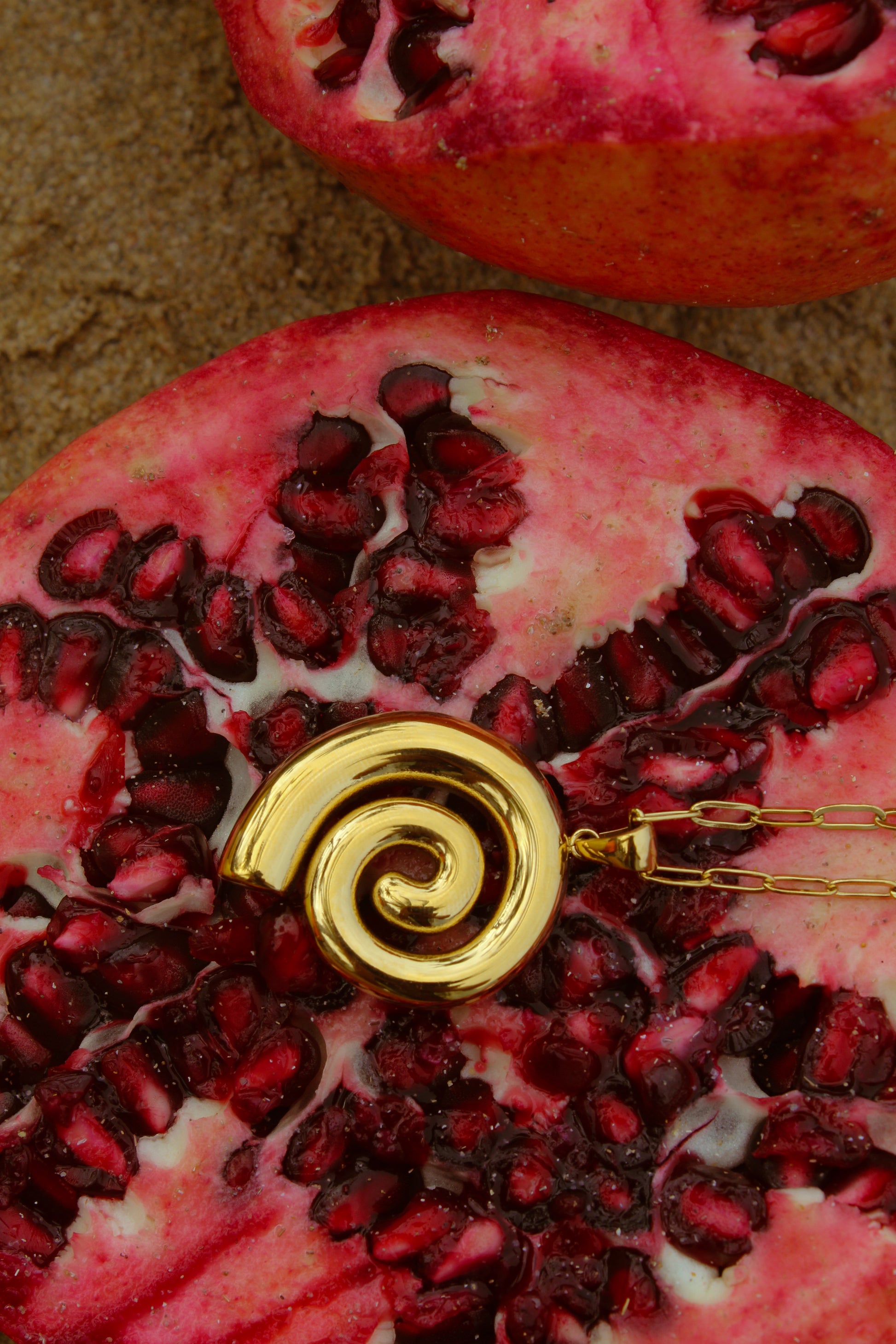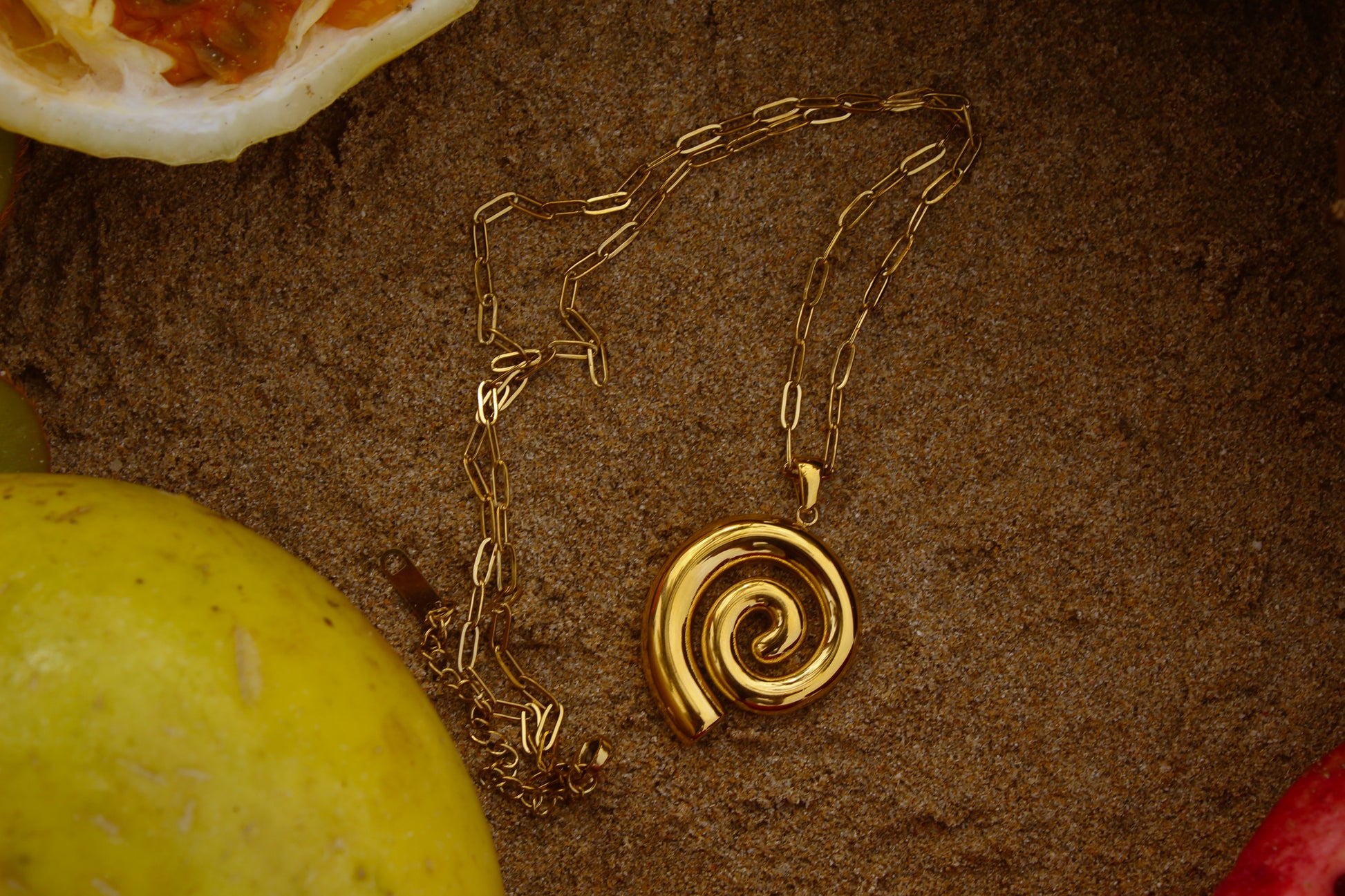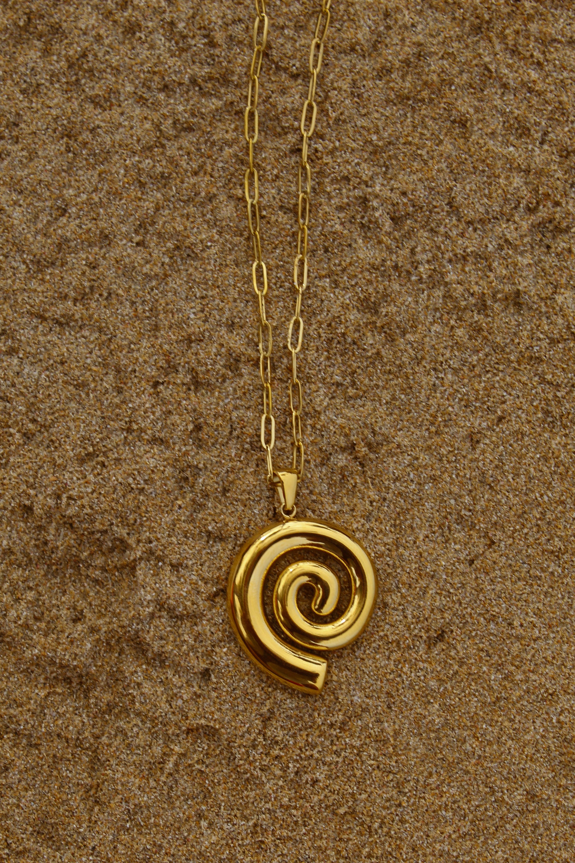 Charm en espiral sobre cadena dorada gruesita. Sólido, con curva suave y energía propia. Un clásico con twist moderno.