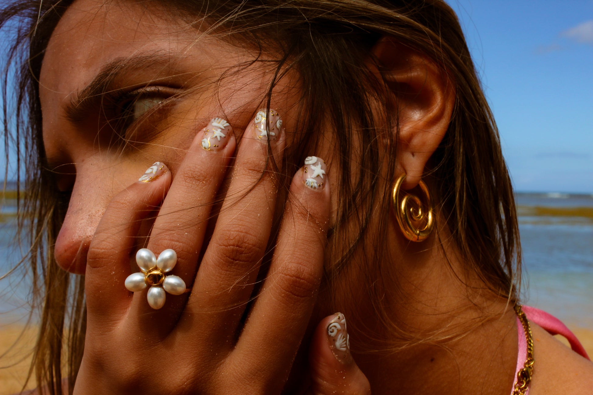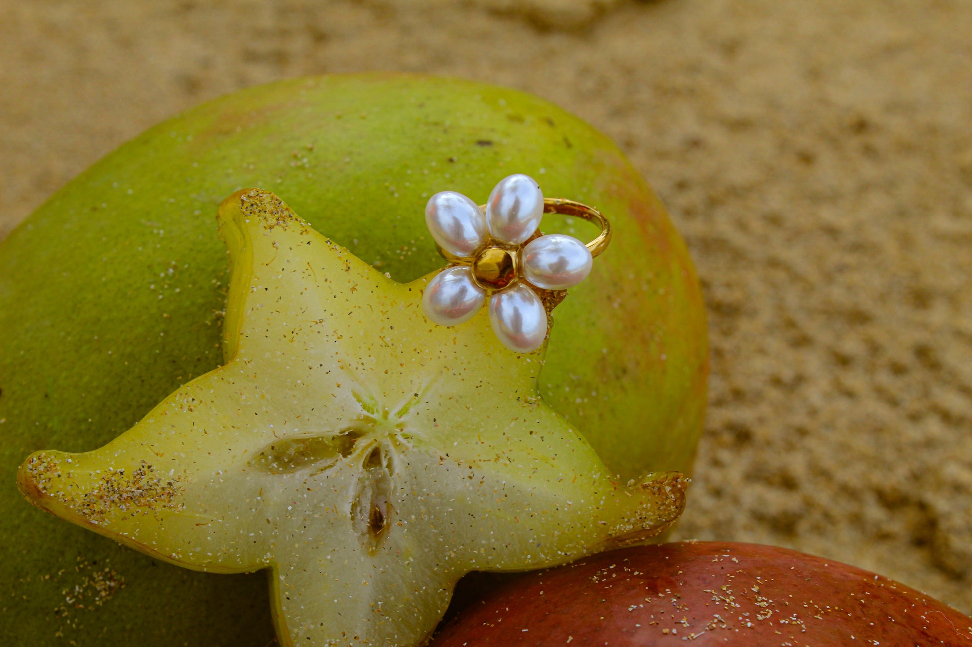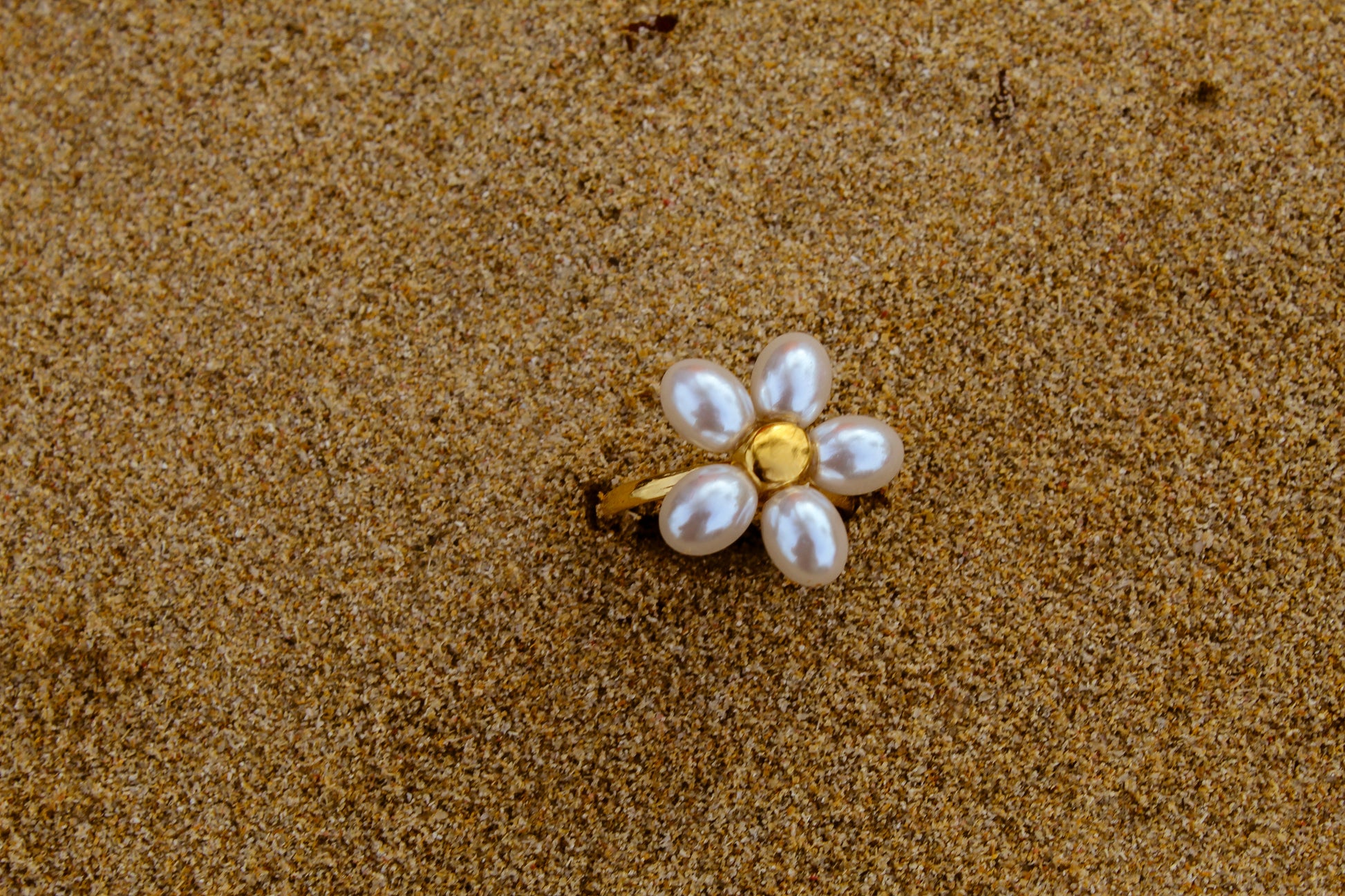 Un diseño minimalista con un guiño retro. Esta sortija combina perlas en forma de flor con una base dorada ajustable. Su estética limpia y juvenil la hace ideal para el día a día o para darle un toque divertido a cualquier look.