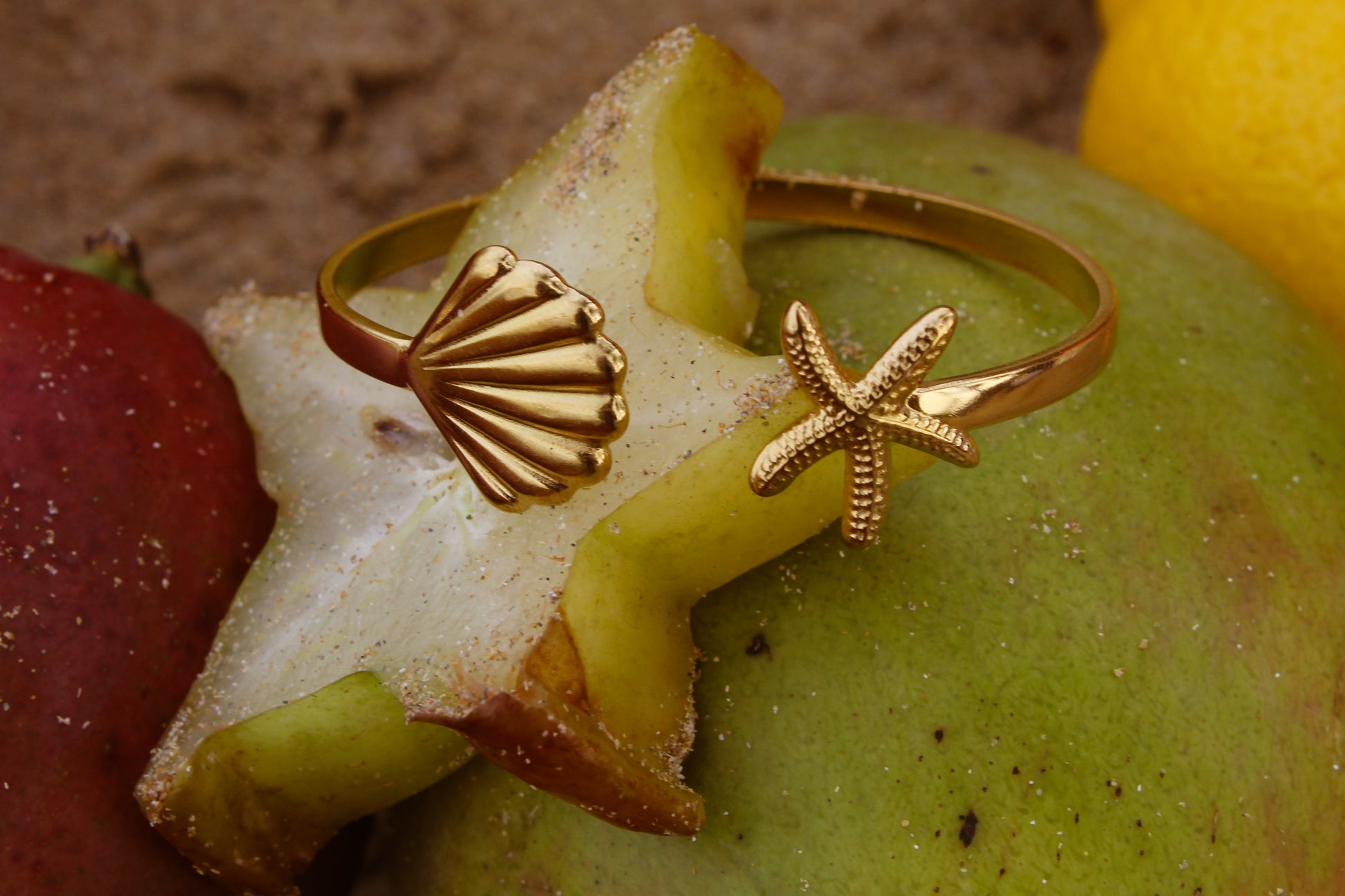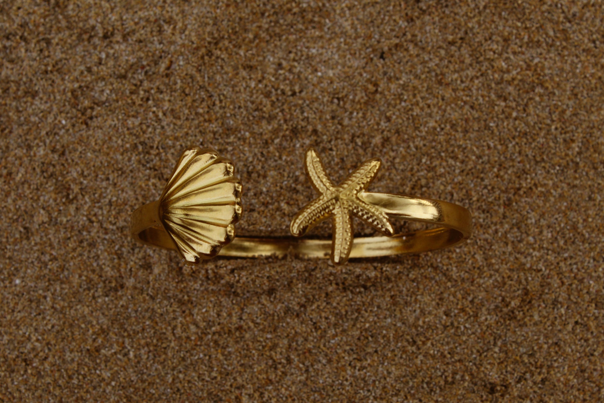 Una estrella y una concha dorada, frente a frente. Diseño abierto, liviano y versátil. Textura playera con acabado pulido. Pa’ llevar el océano en la muñeca.