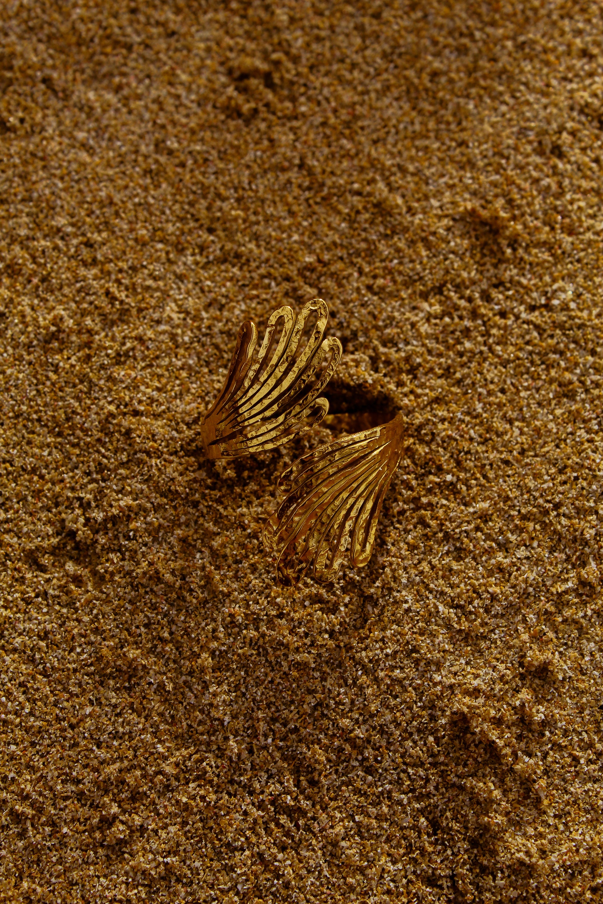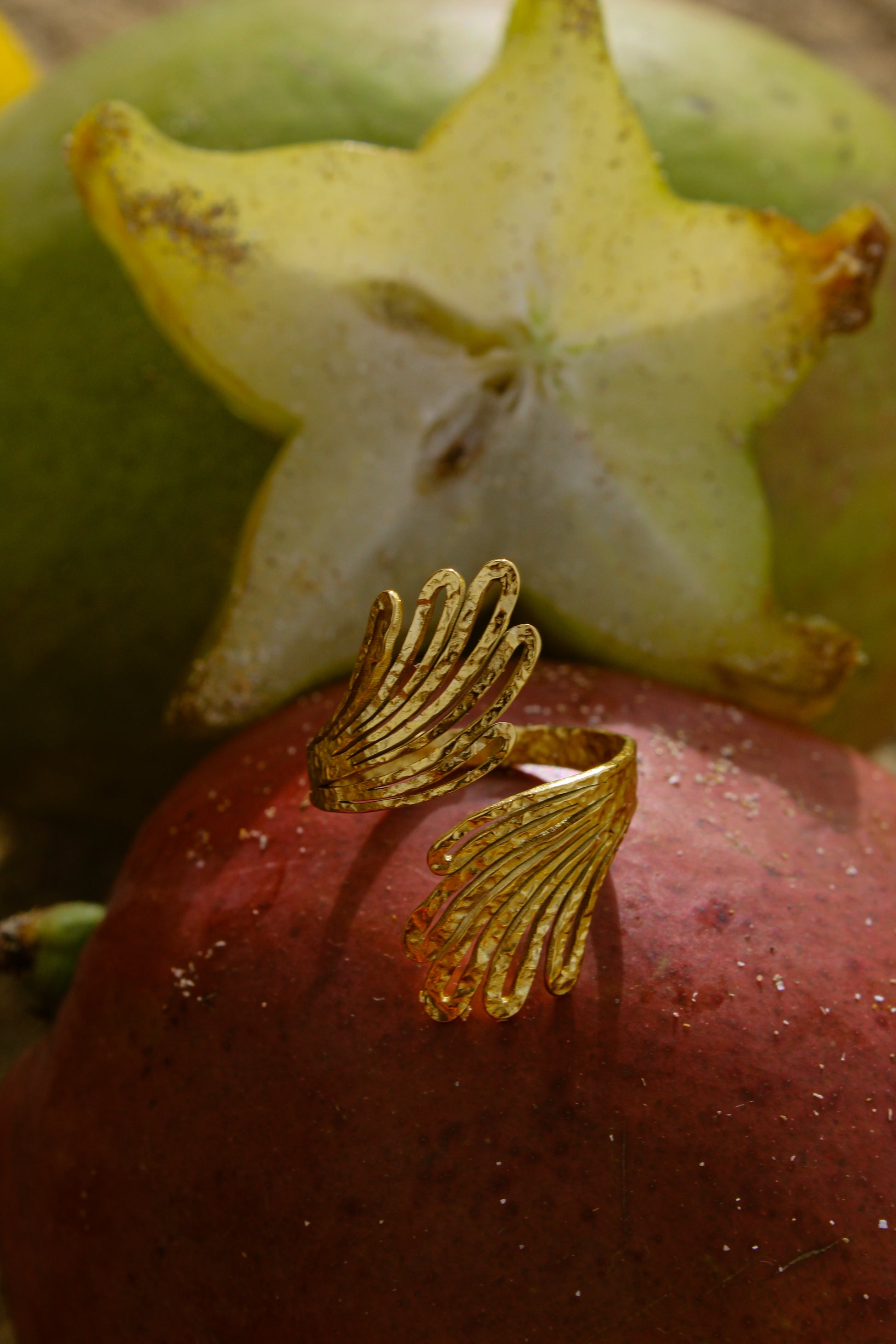 Este anillo abierto está inspirado en las olas del mar boricua. Su forma curva y textura martillada capturan la energía del océano con un toque dorado que resalta en cualquier ocasión.