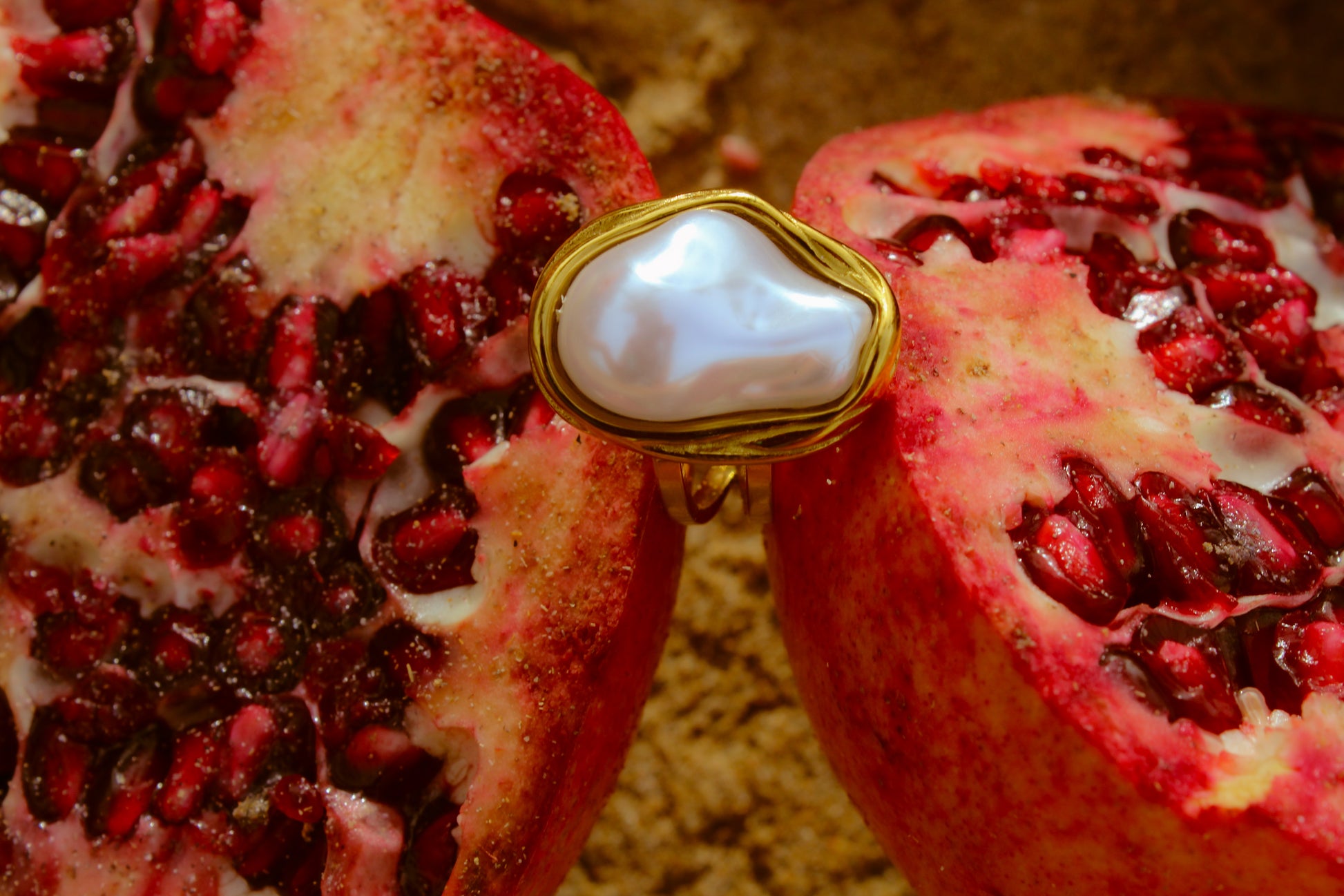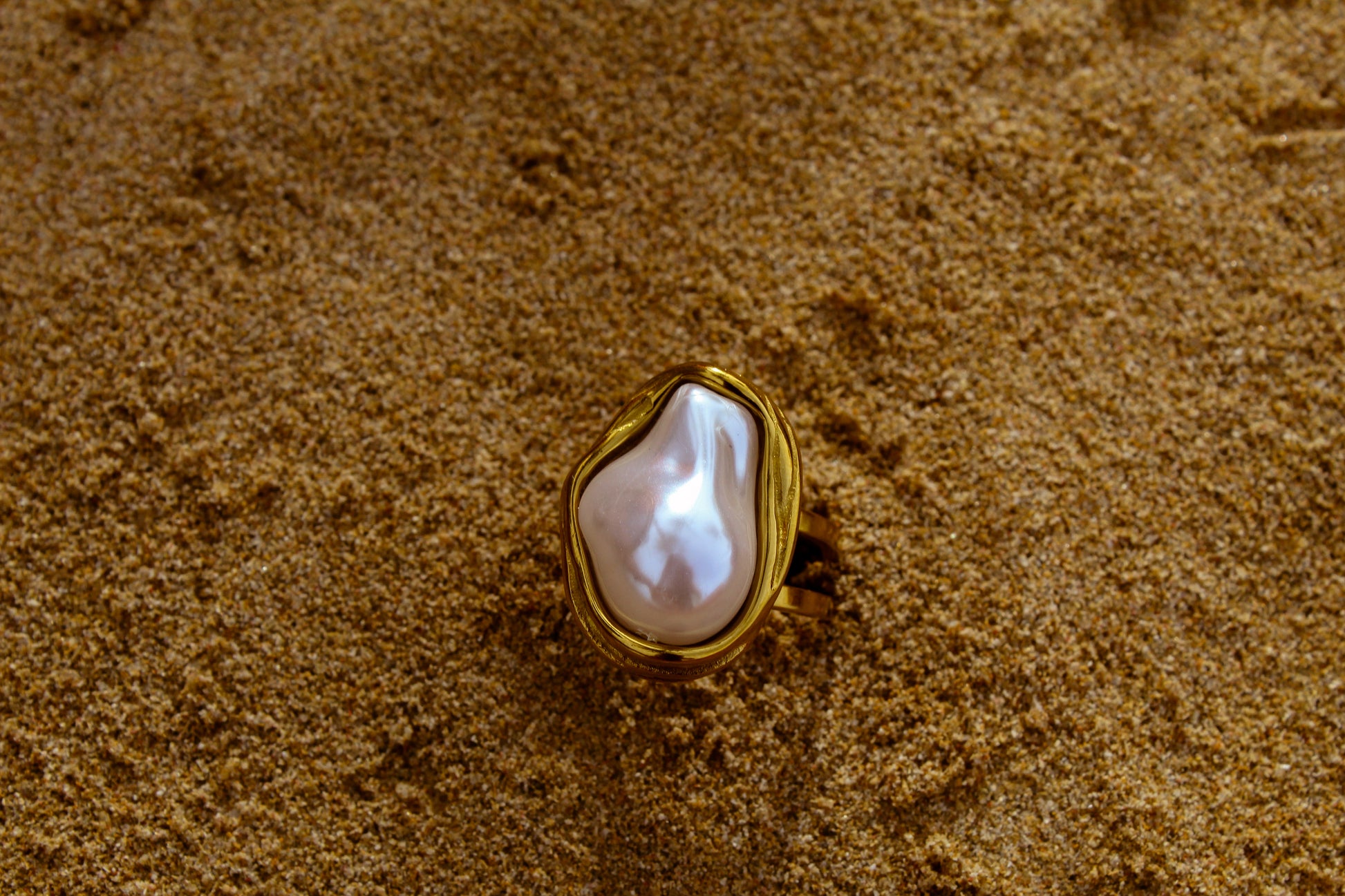 Una sortija que evoca la belleza imperfecta de la naturaleza, combina una estructura dorada fluida con una perla de forma orgánica y crea una pieza que parece moldeada por el mar.