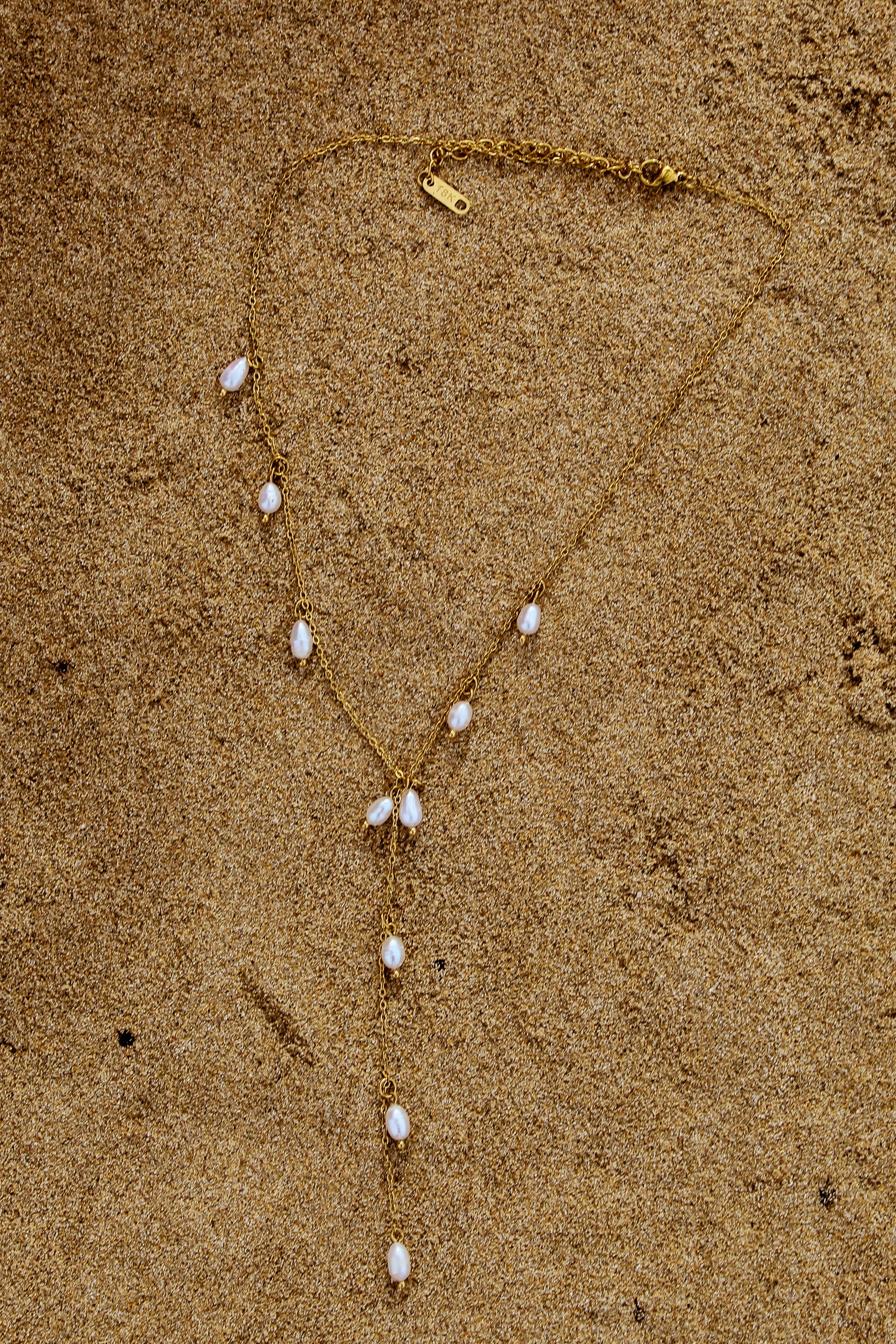 Cadenas doradas finas con perlas en caída. Se siente delicado, pero resalta. El tipo de collar que eleva hasta el look más sencillo.